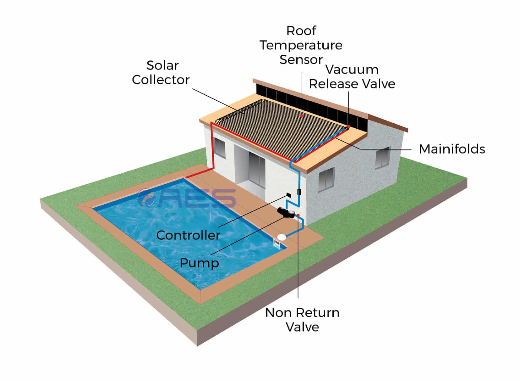 A roof sensor detects when the roof temperature is greater than the swimming pool temperature. The solar controller will then turn on the pump to transfer water from the pool up to the roof, through a solar collector where it is heated by the sun’s thermal energy.